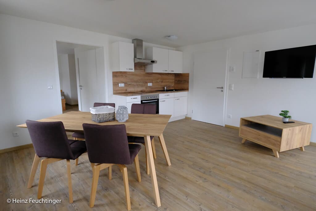 Modern furnished apartment in Straubing with bed linen, towels, hygiene products, bathroom with shower and toilet, also a living room with dining table and fully equipped kitchen. Suitable for 2 adults, available for 3 people on request (request at least 5 days in advance). The two box spring beds can easily be put together as a double bed. A high chair and cot is available if required. Washing machine, dryer and iron are in a common room.