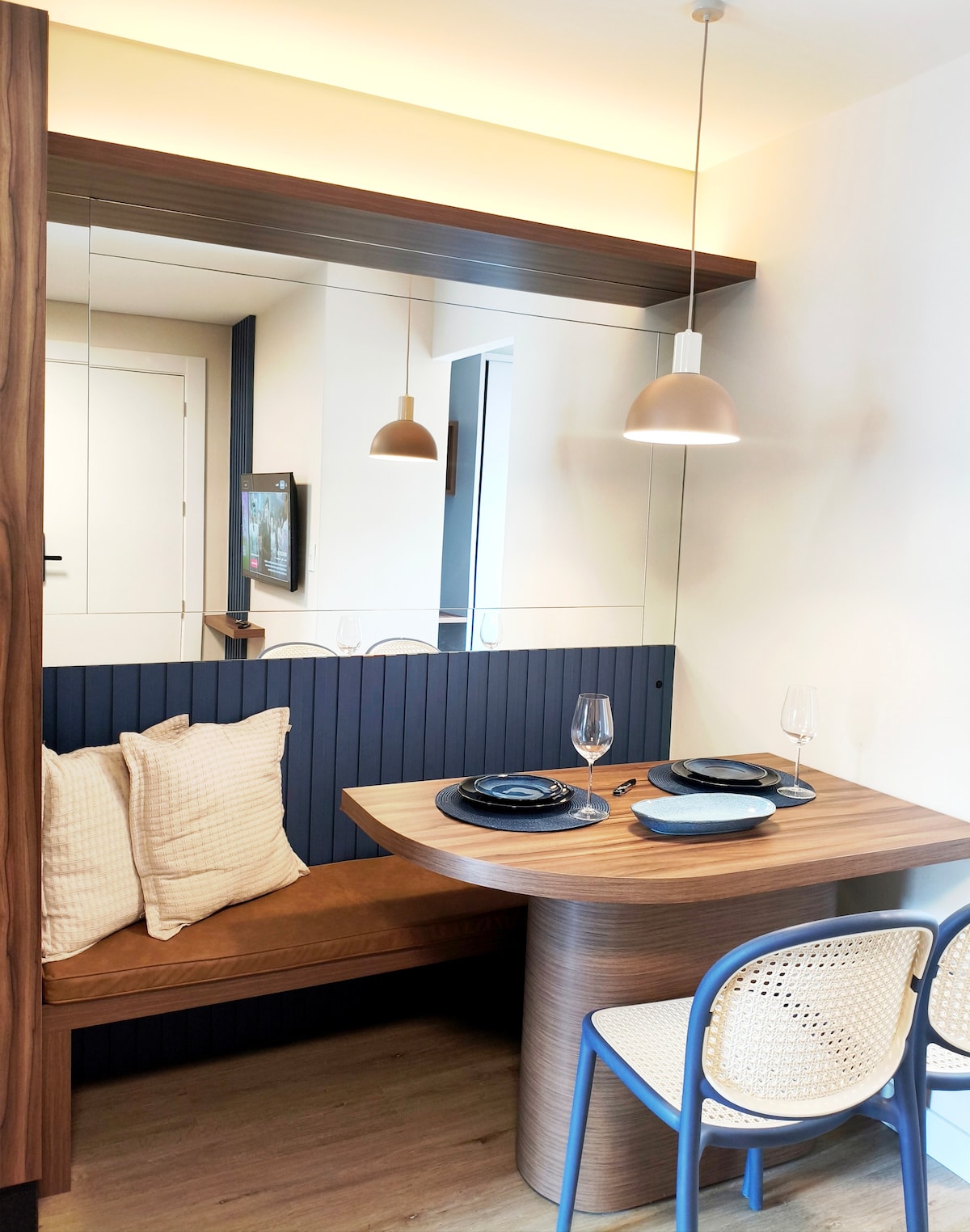 Studio modern în centru, lângă FURB și la 5 minute de Vila Germânica. Wi-Fi, aer condiționat, Smart TV și bucătărie completă. Clădire cu piscină pe acoperiș (cu margine infinită), sală de gimnastică, spațiu de coworking, magazin alimentar și spălătorie cu autoservire. Nu există spațiu de parcare; există locuri de parcare cu plată în fața și lângă clădire. • Încărcător pentru vehicule electrice: utilizarea condominiului, cu înregistrare prealabilă de luni până vineri în timpul programului de lucru și în funcție de disponibilitate.
