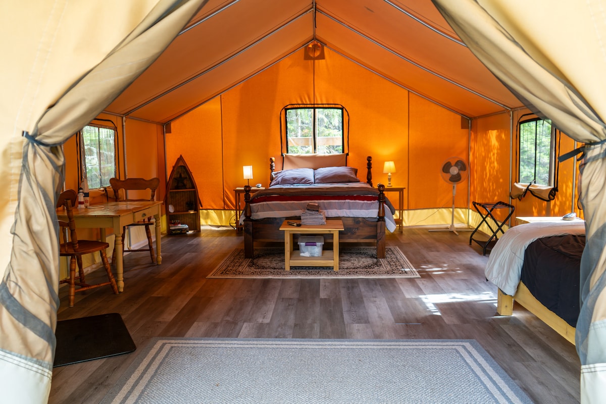Tobique Traditions Glamping oferă o evadare ecologică pe râul Tobique. Acest refugiu alimentat cu energie solară combină confortul modern cu natura. Oaspeții stau în corturi de glamping cu dotări esențiale, reducând la minimum amprenta de carbon. Cadrul liniștit, înconjurat de păduri și ape liniștite, este perfect pentru iubitorii de natură și relaxare. Două corturi împart o baie cu duș complet, chiuvetă în aer liber și toaletă de incinerare, care funcționează ca o toaletă obișnuită, dar incinerează deșeurile în loc să folosească apă.