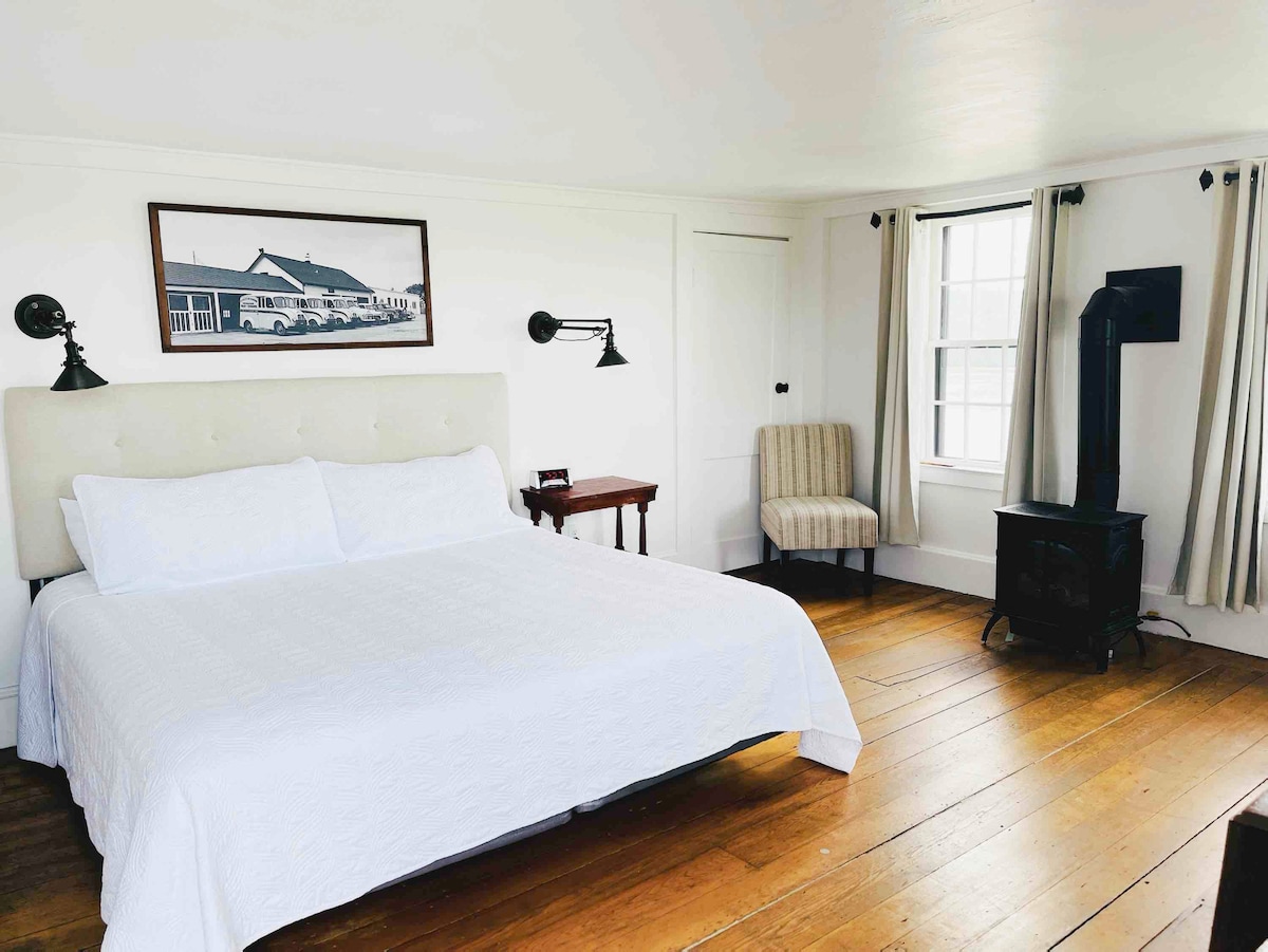 Această cameră King din 1800 de la etajul al doilea are vedere spectaculoasă la râul Machias și puteți vedea The Bad Little Falls în depărtare! Pardoseala veche din lemn, decorul antic și micile detalii din Maine ajută la surprinderea atmosferei istorice a fermei. Confortabil lângă șemineul cu propan la unul dintre citirile și gustările noastre din Maine pe tava cu bunătăți lăsate pentru plăcerea ta. Dacă ai noroc, poți zări vulturi+foci care trec! Acest 1 pat/1 baie ar fi o bază excelentă pentru călătoria ta!