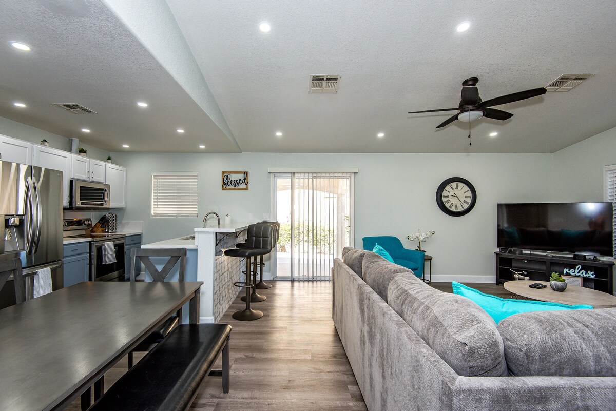 Welcome to Hope Ave Oasis, a centrally located retreat in Kingman, AZ designed for relaxing and entertaining together. Enjoy a fully stocked kitchen, full-body massage chair, calming water feature, zero-gravity recliners with heat and air-bag massage, and an 80” OLED TV for movie nights. Plenty of games and puzzles, close to everything yet private and quiet — a true home away from home.