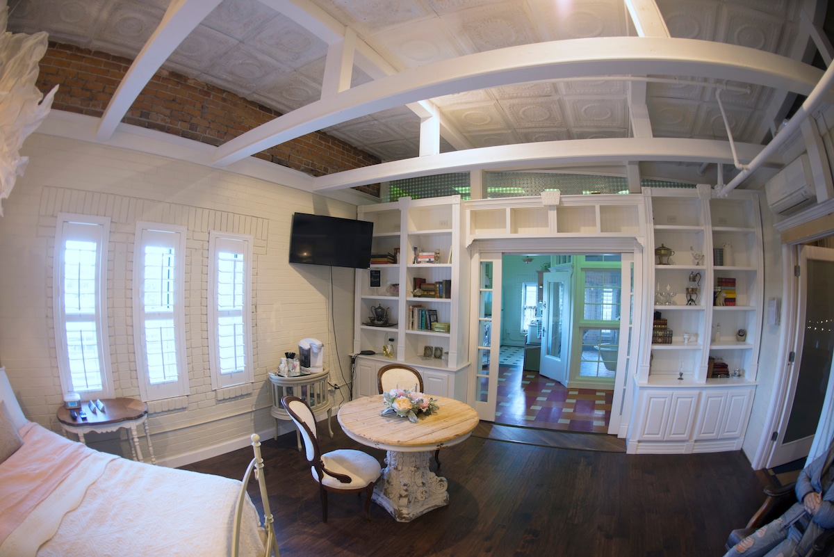 Experiența ta va începe pe măsură ce intri în marea intrare în The Armory și te îndrepți spre camera de zi și apoi urci un al doilea rând de scări spre mansardă. Odată ajuns în apartamentul lui?, te vei afla într-un apartament rafinat cu dormitor, care reflectă o restaurare Chip și Joanna. De acolo se află bucătăria inspirată din anii '50, cu scaune și electrocasnice autentice. Intră în baia uluitoare cu o cadă cu picioare, o măsuță de toaletă pentru biciclete și un duș incredibil înstelat