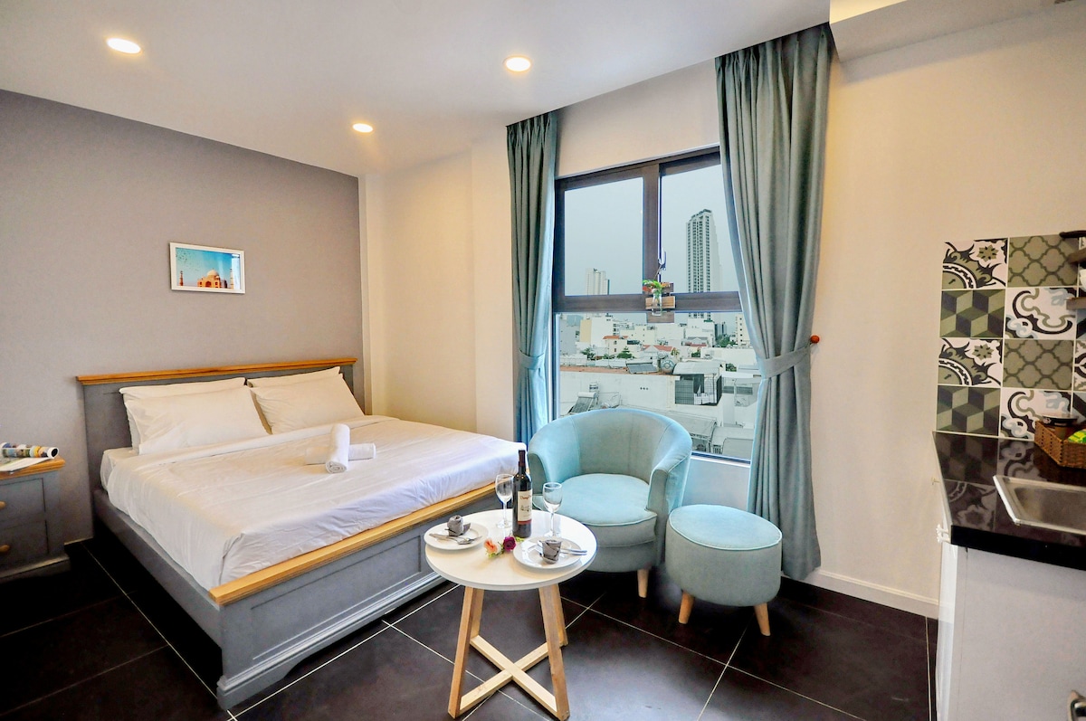 Clădire nouă, 500 m de plajă, 300 m până la minimart, loc sigur_liniștit. Un loc perfect, confortabil, elegant și încape în spațiul tău. Pat confortabil... te face să te simți în casa ta. Camera este complet mobilată cu internet-Tv, Wi-Fi... durează 7 minute de mers pe jos până la piața locală cu fructe de mare proaspete de zi cu zi, carne, legume, fructe și alte produse locale. 1 km până la Hòn Chաng Vizitarea obiectivelor turistice 500 m până la piața locală cu fructe proaspete și mâncare de mare 2 km până la I-resort (baie cu nămol cu izvor termal) 2 km până la Turnul Tháp Bà 4 km până în centrul orașului