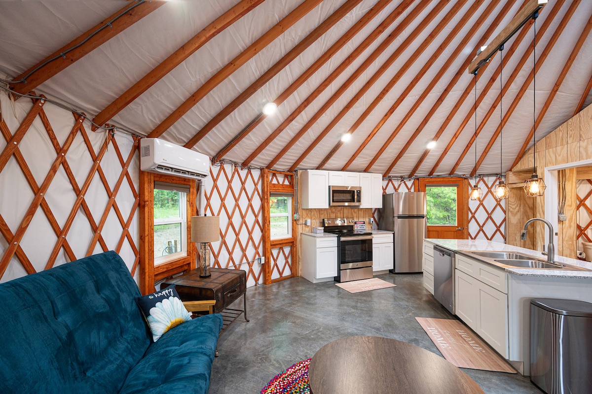 IURTĂ de 30 de picioare cu mansardă și tot luxul unei locuințe (inclusiv CĂLDURĂ și AER)! Acest spațiu unic este situat la ferma noastră de 50 de acri, cu kilometri de trasee și multă intimitate. Acesta nu este cortul tău obișnuit! Acest lucru este glamping la cel mai înalt nivel, cu o bucătărie completă, instalații sanitare regulate, control climatic și tot confortul de acasă. Nu uita, enumerăm acest lucru ca 2 dormitoare, dar al doilea dormitor este o zonă de mansardă deschisă și nu privată. O să vă placă șederea în MEGA Yurt-ul lui Maggie!