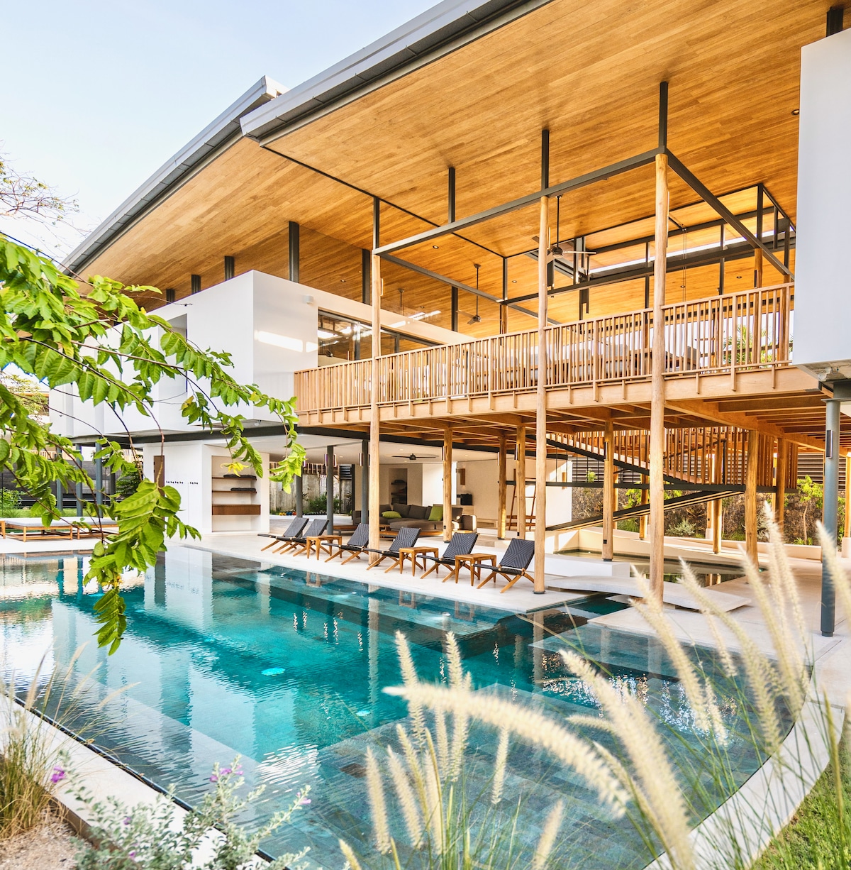 An Airbnb Luxe flagship villa set high above Mal País, Costa Rica. Panoramic Pacific views, 60-ft infinity pool, rooftop jacuzzi, yoga rancho, and gourmet kitchen with optional private chef. Two king-suite bedroom wings with spa-style ensuites and private terraces. Minutes from Santa Teresa's beaches, surf, and dining. Daily housekeeping and concierge support available.