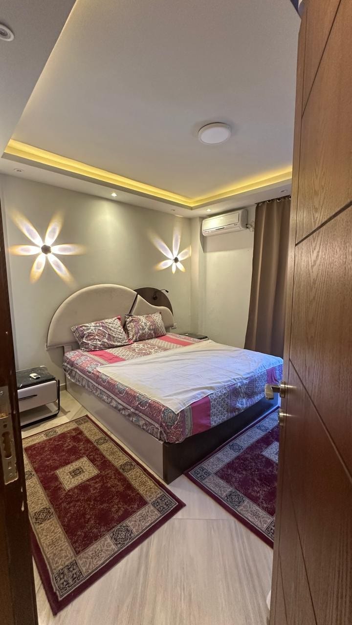 A private apartment in the most prestigious areas of the Fifth Settlement in New Cairo, a full bedroom, a large bed, a wardrobe, a reception, an American kitchen, a bathroom, the apartment is covered with Wi-Fi, and it has a private garden with a large grill and an umbrella, and the apartment is in a privileged location with easy access to any area within Cairo
