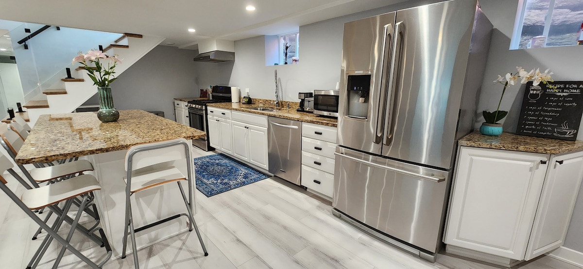 Suită modernă la subsol, complet renovată, de 1500 de metri pătrați, cu intrare privată. - Camere de supraveghere non-stop pentru siguranța ta - încărcător Tesla GRATUIT - PARCARE GRATUITĂ - Bucătărie completă și spălătorie - Liniștit, orientat spre familie, cartier sigur - FĂRĂ PETRECERI! - Aproape de Aeroportul Internațional O'Hare (18 minute), centrul orașului (15 minute fără trafic), centru comercial (2 minute) - La o distanță de mers pe jos (20 de minute) de stația Metra, care te duce în centrul orașului Chicago până la Union Station -80 inch TV, Netflix, HBO, Hulu...