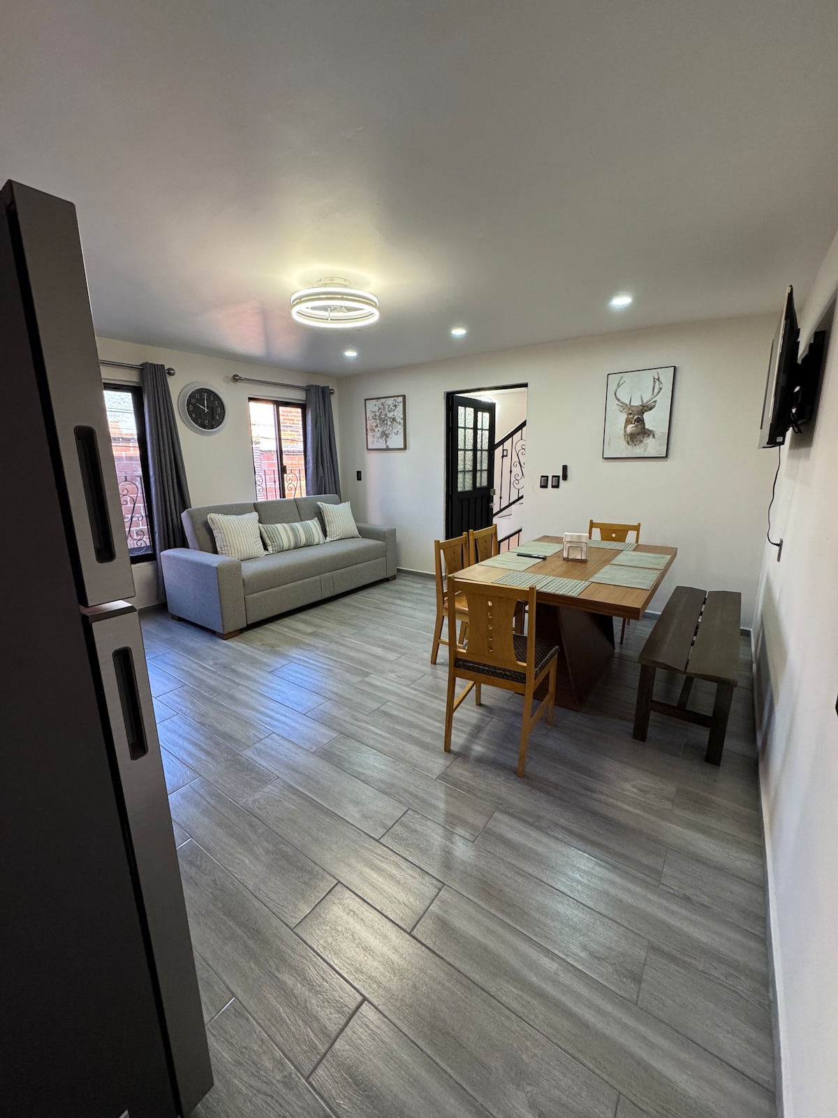 A 2.5 cuadras del mercado y la parroquia, sobre la calle Esperanza Quezada Norte encuentras todo tipo de comida, farmacias, tiendas y entretenimiento para todo tipo de familia. A una cuadra de Oxxo, en el piso de abajo hay farmacia con Médico. Cuenta con secadora y calefacción.