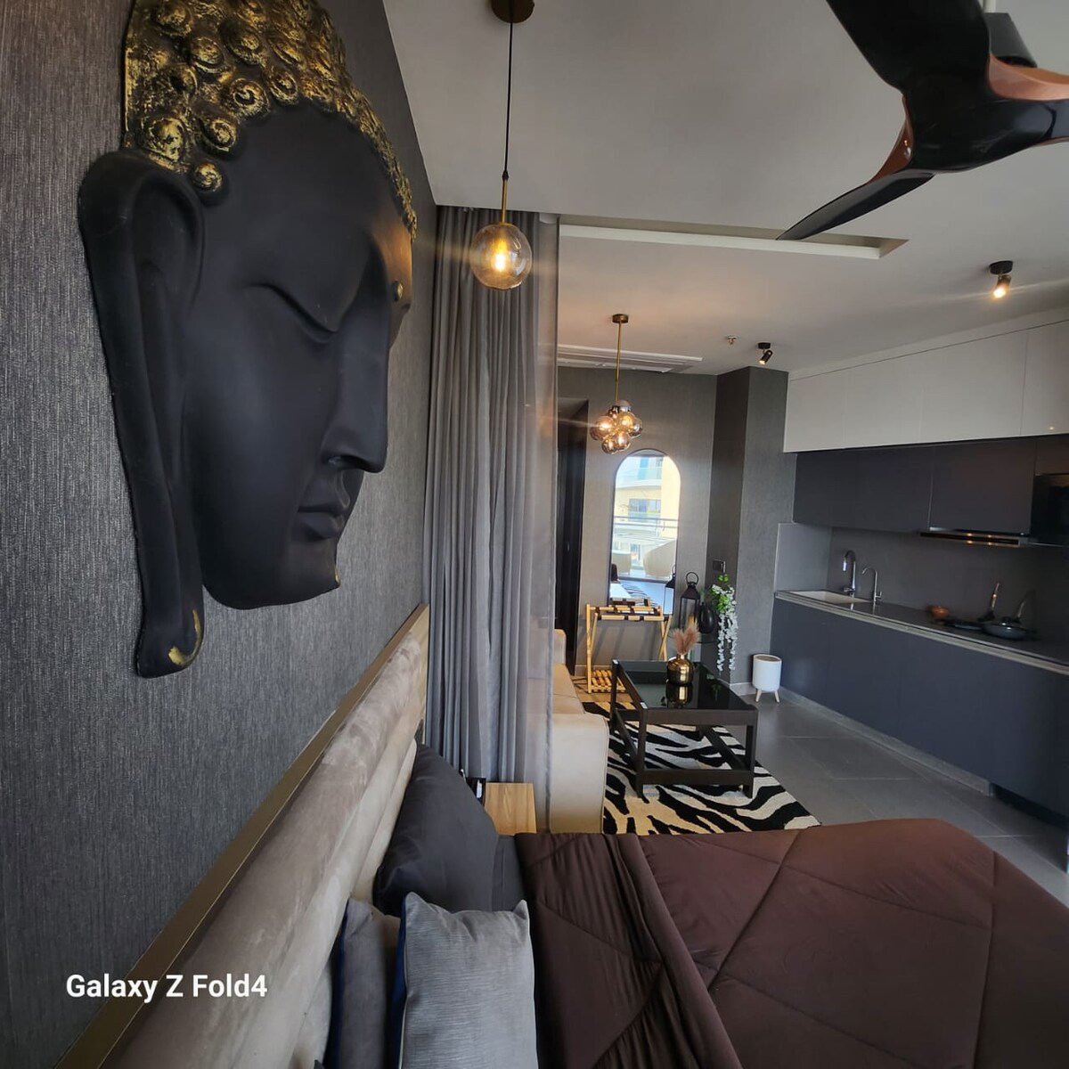 Relaxează-te în acest studio calm și luxos, cu căldura de acasă și atmosfera unui hotel de lux. Mobilat cu un pat matrimonial de pluș și decor modern. Dotări: Magazin alimentar non-stop Chicinetă modernă Wi-Fi și TV de mare viteză Parcare securizată în afara turnului, dar securizată non-stop Primele 2 etaje au magazine comerciale, care oferă: Servicii de spălătorie Salon Cafenea Magazin medical Acces ușor la India Expo Mart, Buddh International Circuit. Perfect pentru cupluri, persoane care călătoresc solo sau parteneri de afaceri.