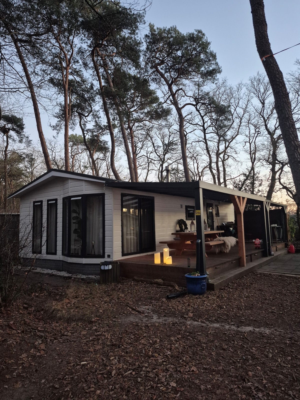 La marginea parcului se află această cabană privată de 50 m2, cu o verandă de 26,5 m2. Această cabană găzduiește 4 persoane. *Living cu uși franceze. *Bucătărie cu aragaz, cafetieră, mașină de spălat vase, combinație cuptor/cuptor cu microunde/grătar și frigider. *Două dormitoare. *Baie cu toaletă, chiuvetă și duș: apă caldă și rece. *Verandă cu mobilier *Terasă cu mobilier de grădină. *Terasă lângă apă cu o masă de picnic. *Wi-Fi gratuit. Parcul are un lac potrivit pentru înot.