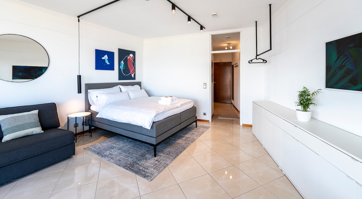 Top Suite 35 sqm Augsburg Central Congress Hall Highlights: King size box spring bed 180*200 cm - electrically individually height adjustable 55 inch Neo-QLED TV with Netflix 100 K Internet for streaming and home office. Complete kitchenette incl. cooking and spice utensils. Bathroom with LED mirror and walk-in shower. 22 Floor of the hotel tower with wide view and balcony. Within walking distance: Main train station, city center, Wittelsbacher Park. Daniel & Stefan are ready for support
