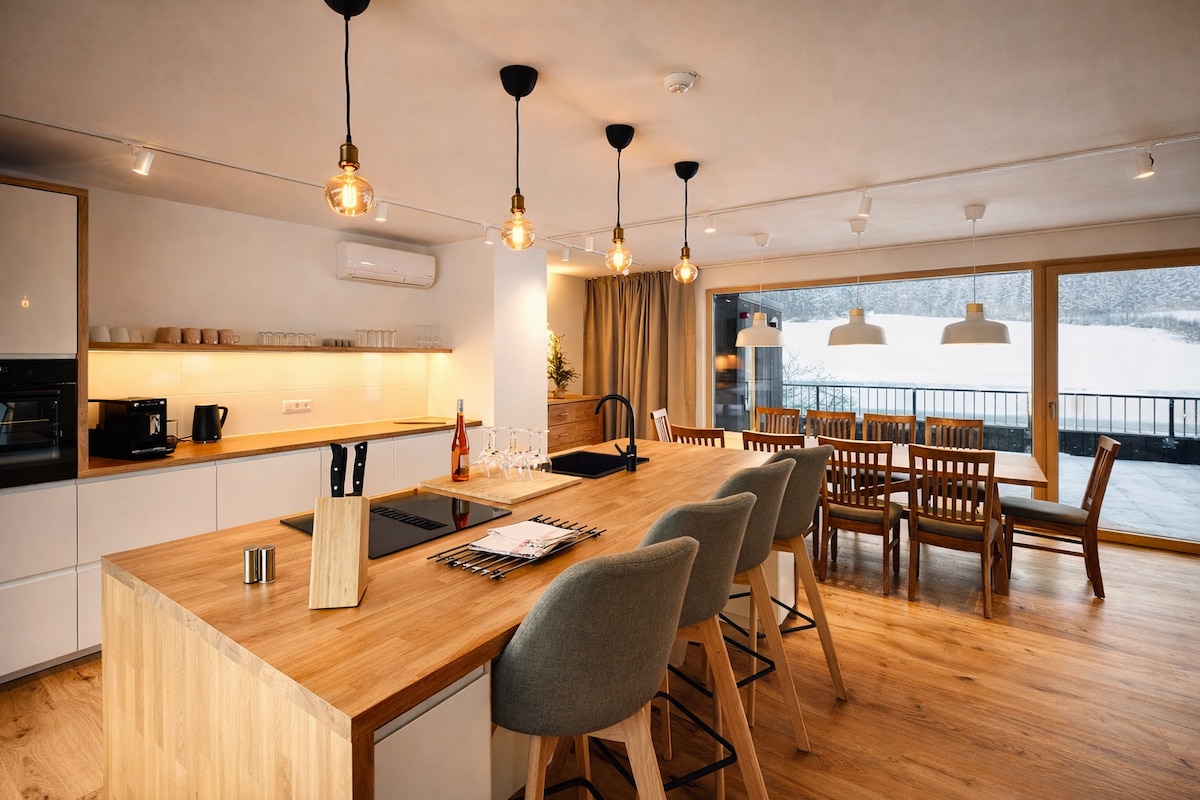 Bine ai venit la penthouse-ul GIPFEL-GLÜCK. Apogeul Sunleitn Residence: 107 m² (1.153 ft²), cu o zonă deschisă de living/luat masa și o verandă uimitoare cu acoperiș din sticlă. Bucătărie complet utilată și acces la terasa spațioasă cu o priveliște panoramică de 180° asupra munților, în deplină intimitate. Relaxează-te în sauna finlandeză privată din lemn reciclat, cu vedere la munți. 2 dormitoare, ideale pentru până la 4 oaspeți.