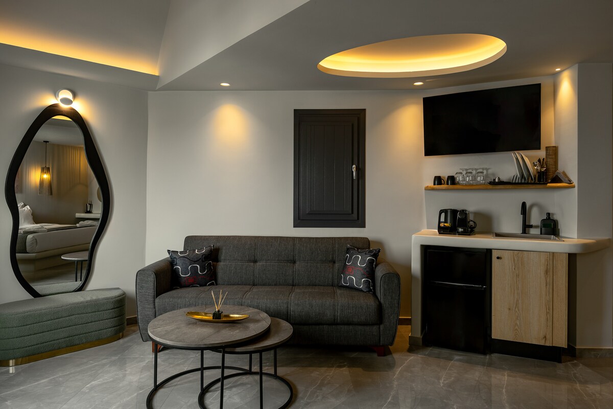 Relaxează-te într-un apartament de 45 m² cu aer condiționat, unde confortul întâlnește peisaje uluitoare. Apartamentul include un dormitor elegant cu un pat matrimonial, un living confortabil și o baie contemporană cu duș. Ieși pe terasa privată pentru a te bucura de priveliști uimitoare la mare sau relaxează-te în cada cu hidromasaj în aer liber pentru o experiență cu adevărat indulgentă. Kudos Suites Firostefani oferă, de asemenea, o piscină infinită comună cu vedere la Marea Egee.