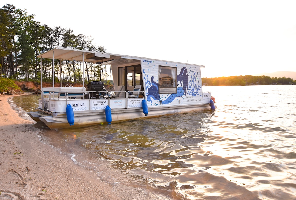 The Mermaid Houseboats roam the waters of Lake James in NC, with beautiful views of the Blueridge Mountains and sandy beaches to pull ashore. Amenities include: Convenience kitchen (pump sink, coffee maker) Propane grill Sofa (double bed) Table (booth seating folds into a single bed) Capacity to sleep 2-3 adults or family Large front deck for entertaining Generator provides electric AC (run by generator) Bed linens provided Marine toilet *Born 1988 or later boating license required.