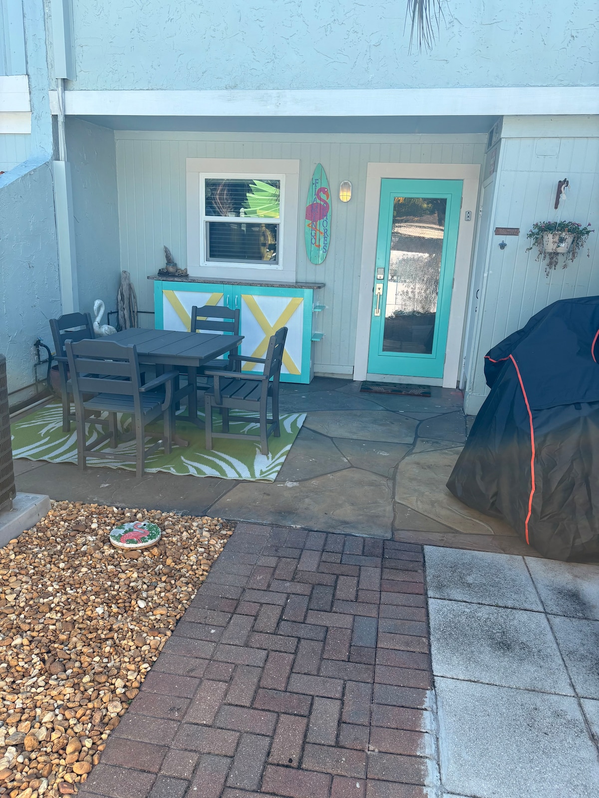 Unitate privată superbă, liniștită, la 30 de metri de plajele imaculate! Revista de pe coastă tocmai ne-a evaluat ca fiind primele 10 plaje din țară. Casă înșiruită pe malul oceanului, complet renovată. Vedere la ocean, decor de coastă, locuri de dormit 6. King in master en suite, queen on ground level w full bath, 2 twins in 3rd w/ full hall bth. Unitate de colț cu multă intimitate pe terasă și dormitor matrimonial la etajul al doilea cu terasă. Mese, cumpărături și sporturi nautice. Disney, Sea World, toate în apropiere. CĂRUCIOARE DE GOLF disponibile pentru închiriere.