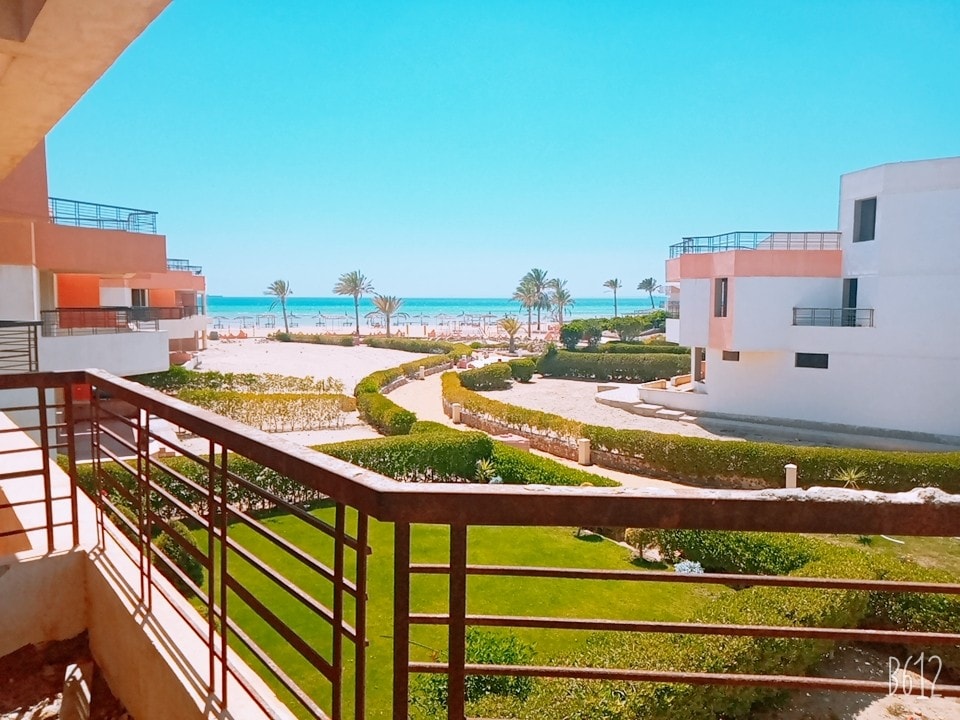 Amazing new cozy private chalet, ground floor with a private garden facing the swimming pool, 3 mins. walk from the sea The chalet has: - 2 Air conditioned rooms (1 big room with double bed, 1 small room with 2 single beds). - Reception with TV, Sofa bed, Couch, Chairs & 2 big stand fans. - Fully furnished American kitchen (Oven, refrigerator, Kettle, microwave..etc.) - Terrace with nice seating & Grill. In the resort there's a restaurant, security, coffee shop, billiard room.