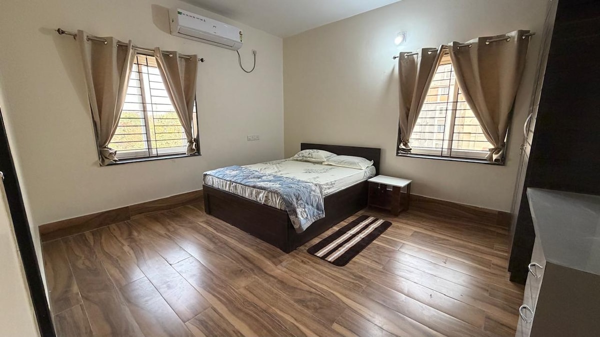 1 bhk, parter în casă independentă. Locuința noastră este ideală pentru familii, prieteni și cupluri căsătorite care caută o ședere liniștită și confortabilă. Cazează-te în locuința noastră de top, complet mobilată, la parter, cu paturi de lux, Smart TV, WiFi gratuit, rezervă invertor și o bucătărie modernă (gaz, inducție , cuptor cu microunde). Amplasat în verdeață luxuriantă, cu un spațiu spiritual de pooja, oferim personal non-stop, parcare auto și servicii de parcare pentru oaspeți. Cu mândrie o Super-gazdă care prețuiește ospitalitatea excepțională! Te conectezi cu plăcere! 🚗✨