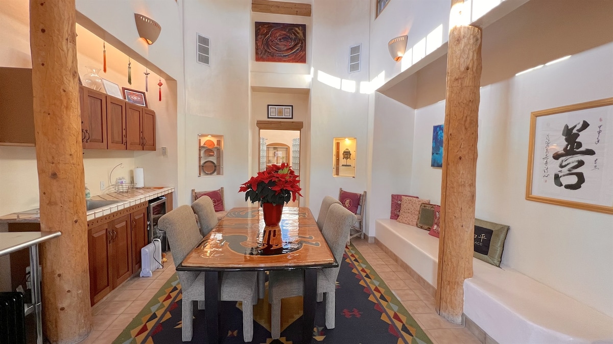 Situat în mijlocul copacilor din parcul Sandia. Dispunerea răcoritoare deschisă și ferestrele de la podea la tavan oferă o relație senină cu exteriorul. Livingul găzduiește o serie de mobilier contemporan în jurul unei sobe pe peleți. Bucătăria este complet iluminată în timpul zilei de ferestrele înfășurate. Locuința contemporană creată oferă priveliști impresionante ale lanțului muntos din apropiere. Doar 35 de minute până la fiesta cu baloane. Vizitează fiesta cu baloane în timpul zilei și bucură-te de Skyline Glass House noaptea.