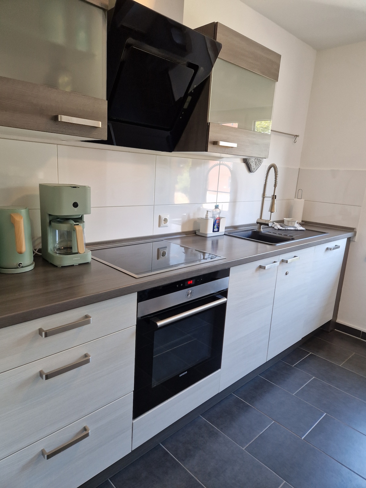 The modernly furnished apartment with a fully equipped kitchen including a fully automatic coffee machine has a simple and not cluttered style. The balcony invites you to relax in the evening sun. So that you don't have to miss the most popular series outside your home and enjoy Netflix, Disney+ and RTL+ for free.