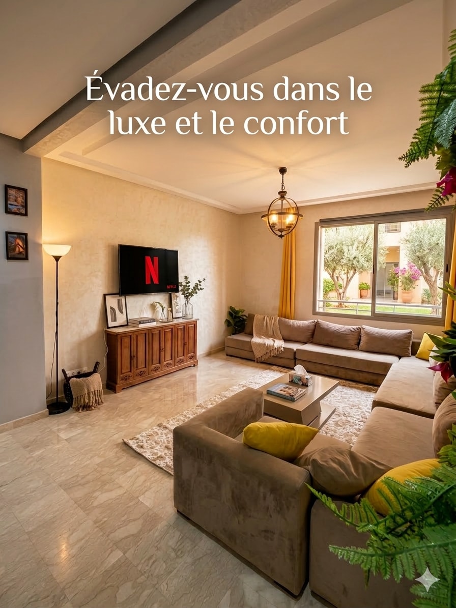 Bienvenue à L’Élégance, un appartement moderne et raffiné situé à Nouaceur, à seulement 5 minutes de l’aéroport Mohammed V. Niché dans une résidence neuve et sécurisée avec ascenseur, ce logement offre un cadre à la fois confortable, calme et pratique, idéal pour les voyageurs. Vous pourrez également profiter d’une piscine partagée avec un espace dédié aux enfants, au cœur d’un environnement verdoyant et paisible, parfait pour un séjour de détente, qu’il soit court ou prolongé.