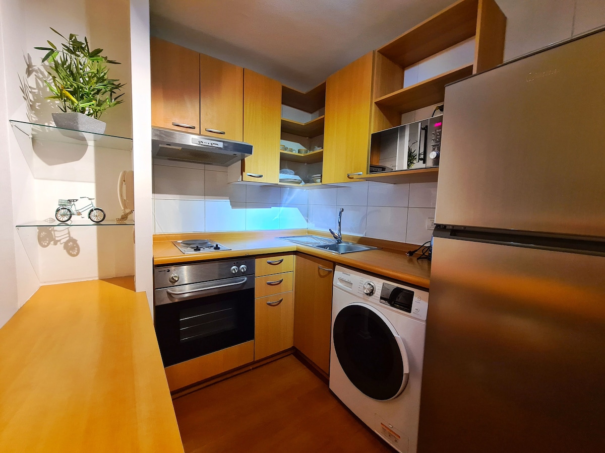 Disfruta tu estadía con estilo y comodidad 4 personas. Lo que encontrarás: A/C Frío/Calor 1 Hab con Cama King 1 Sofá Cama king 1 baño completo con shampoo, acondicionador, jabón corporal y secador de pelo Cocina equipada: cafetera, microondas, tostador, hervidor y horno. Ideal para preparar tus comidas favoritas. Zona de trabajo, WiFi y escritorio, perfecto para viajeros remotos Lavadora/Secadora dentro del depto, para mayor comodidad. Estacionamiento privado y gratuito Piscina Gym Quincho