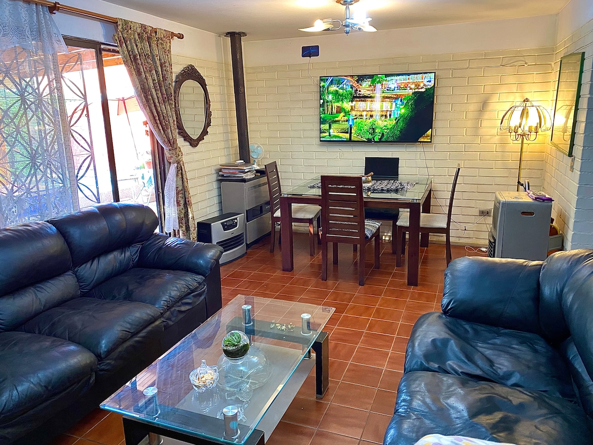 Bucură-te de un sejur la Casa Las Condes! Această casă de familie spațioasă și modernă oferă combinația perfectă de liniște și odihnă, cu o terasă mare, piscină, quincho și înconjurată de copaci, piață și natură. Foarte confortabil, căldură acasă în timpul iernii cu o sobă Bosca, ideal pentru familii cu copii, living cu Home Cinema, bucătărie mare complet utilată, blat, mașină de spălat vase și multe altele. Dormitor principal cu baie proprie + aer condiționat. Biciclete de condus. Parcare