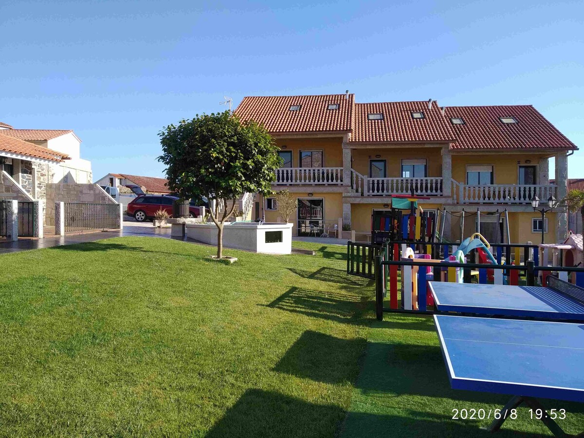 Bine ai venit în locuința ta din Rías Baixas! Apartamentele noastre din piatră și lemn combină tradiționalul cu cel modern. Acestea au o bucătărie complet utilată (cuptor cu microunde, cafetieră, prăjitor de pâine și fier de călcat) și o baie cu duș, uscător de păr și articole de toaletă de bază. Vei dormi ca un buștean în camerele noastre confortabile. Livingul are un șemineu pentru nopți răcoroase și te poți relaxa în zona de relaxare cu jacuzzi. Vino și bucură-te de esența galiciană autentică și uită de stres!