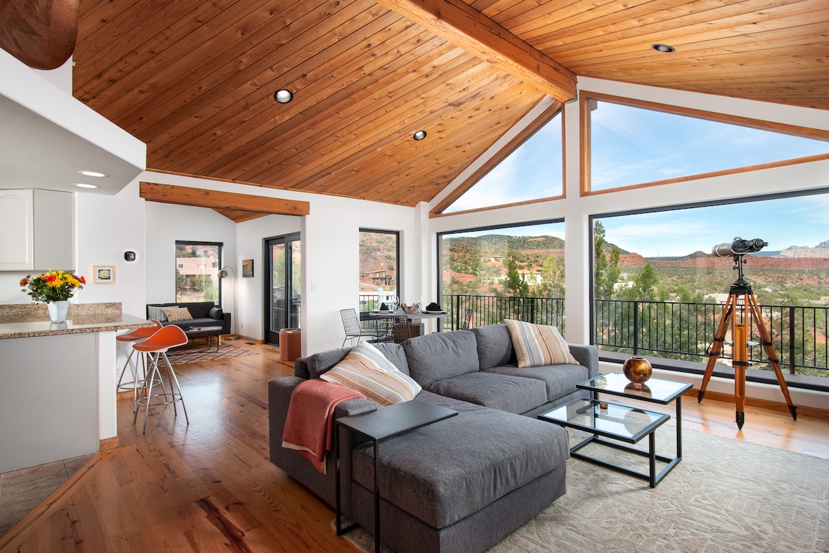Premiată ca fiind una dintre „Cele mai bune 12 cazări din Sedona” 100% REMODELATĂ. VEDERE DE LA ÎNALT, LINIȘTIT, ACCES LA TRASEE ȘI LABIRINT PRIVAT! Senzație de spa de zi. Casă privată, liniștită, în faimoasa zonă a vârtejului Capela Sfintei Cruci. Relaxează-te pe canapea cu vedere la stânca roșie sau fă o plimbare de 2 minute până la sistemul de trasee Broken Arrow! Podele din lemn, aparate de uz casnic de ultimă generație, dușuri cu intrare la nivelul solului cu podele din pietriș, spa, blat de cuarț cu cascadă, oglinzi iluminate din spate, chiuvete din onix, apă caldă instant, paturi de lux, terasă, birou.