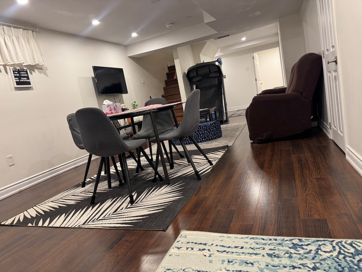 Bine ai venit în apartamentul nostru confortabil de la subsol din inima orașului Toronto! Acest spațiu complet mobilat are un dormitor confortabil, o zonă de living elegantă, o chicinetă bine echipată și o baie modernă. Bucură-te de Wi-Fi de mare viteză, un televizor inteligent și acces convenabil la mijloacele de transport în comun, magazine și restaurante. Ideal pentru călătorii singuri sau cupluri care caută un refugiu liniștit într-un cartier vibrant. Și bebelușii sunt bineveniți. Rezervă-ți șederea astăzi și bucură-te de tot ce este mai bun în Toronto!