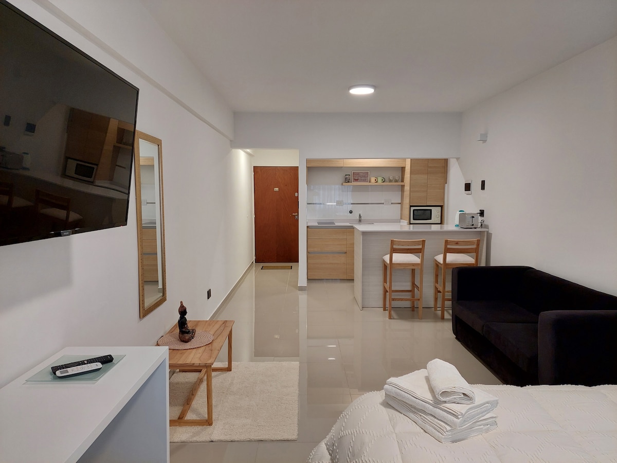 Un apartament impecabil situat la o stradă de Obeliscul din Buenos Aires. Cu acces rapid la metrouri și autobuze pe toate liniile, la metri de faimosul Corrientes Avenue, zona de teatru și restaurantele tipice. Clădirea are securitate 24 de ore. Apartamentul are un pat matrimonial, cu o placardă, TV de 43″ și WiFi. Canapea din două piese. Bucătărie cu frigider, aragaz electric și cuptor cu microunde. Insula pentru micul dejun. Baie completă. Toate reciclate în nou.