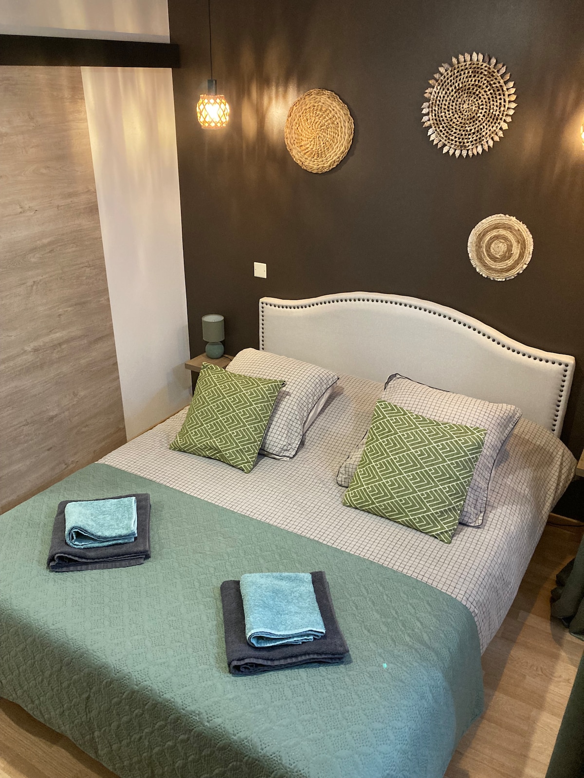 This 21m² space features a large queen-size bed (160x200 cm), a fully equipped kitchen with a coffee maker, microwave, induction stovetop, cooking utensils, and soap, high-speed Wi-Fi, a ceiling fan, private secure parking (free for short stays), and access to amenities like a gym, projection room, gaming studio, dining area, and garden.