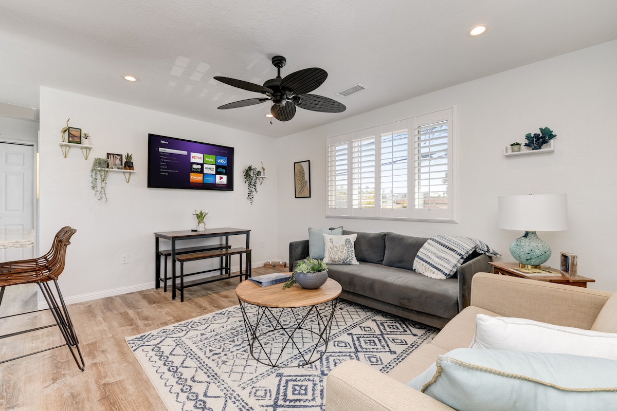 Adu întreaga familie în cabana noastră elegantă și confortabilă de pe plajă! Mergi pe jos până la Ocean Beach și Dog Beach, apoi plimbă-te pe Newport Ave pentru mâncăruri și băuturi grozave. Bucură-te de cafeaua de dimineață în curtea din față împrejmuită sau aprinde un grătar la apusul soarelui în spate. Încheie ziua cu o excursie la Sunset Cliffs pentru a urmări un apus de soare uluitor! Animalele de companie sunt binevenite (taxă de 100 USD pentru animale de companie). Simplu, curat și aproape de tot - perfect pentru zilele fără griji petrecute împreună pe plajă. Aerul condiționat și Wi-Fi-ul rapid îi mențin pe toți confortabili, iar livingul spațios este excelent pentru distracția din noaptea de film!!