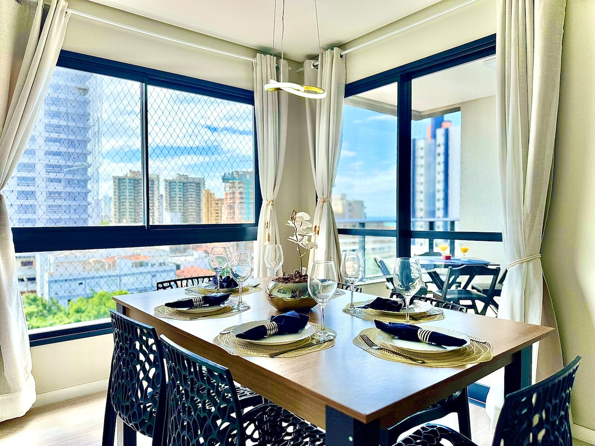 Apartament renovat și decorat, cu farmec și confort. De la etajul 12, priveliștea este uluitoare, cu vastitatea mării în fața ei. Toate noi, ideale pentru odihnă și pentru a te bucura de familie și prieteni. Poziția este privilegiată, la câțiva metri de plajă, unde te poți plimba și relaxa pe nisip. În apropiere se află restaurante, piețe și farmacii, iar Beto Carrero World Park, cel mai mare parc tematic din America Latină, se află la doar 15 m. Fermecătorii Piçarras te așteaptă! ✨