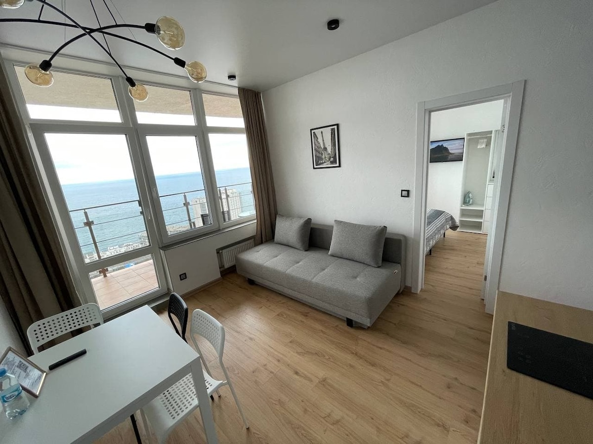 Oferă aer condiționat și Wi-Fi gratuit. Vă puteți relaxa pe terasa confortabilă, bucurându-vă de vederea la mare Apartamentul de 24 de metri pătrați are o bucătărie complet utilată cu cuptor cu microunde, zonă de living, TV cu ecran plat, baie privată cu mașină de spălat, uscător de păr. Facilitățile includ frigider, aragaz, ceainic. Locul de dormit este un pat dublu. În complex există un magazin, o farmacie, o cafenea și alte servicii, un supermarket mare este situat în apropiere