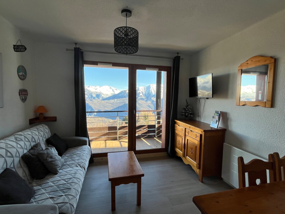 Studio confortabil și cald pentru 4 persoane la poalele pârtiei. Oferă vedere la munte. Garsonieră de 22m², inclusiv o bucătărie închisă, baie cu WC separat. Spații de dormit: 1 pat dublu în loft și o canapea extensibilă dublă în camera principală cu TV cu ecran plat. Un balcon completează cazarea. Garsonieră situată ideal, la poalele pârtiilor și teleschiurilor și aproape de toate facilitățile și beneficiază de o cameră de schi închisă.