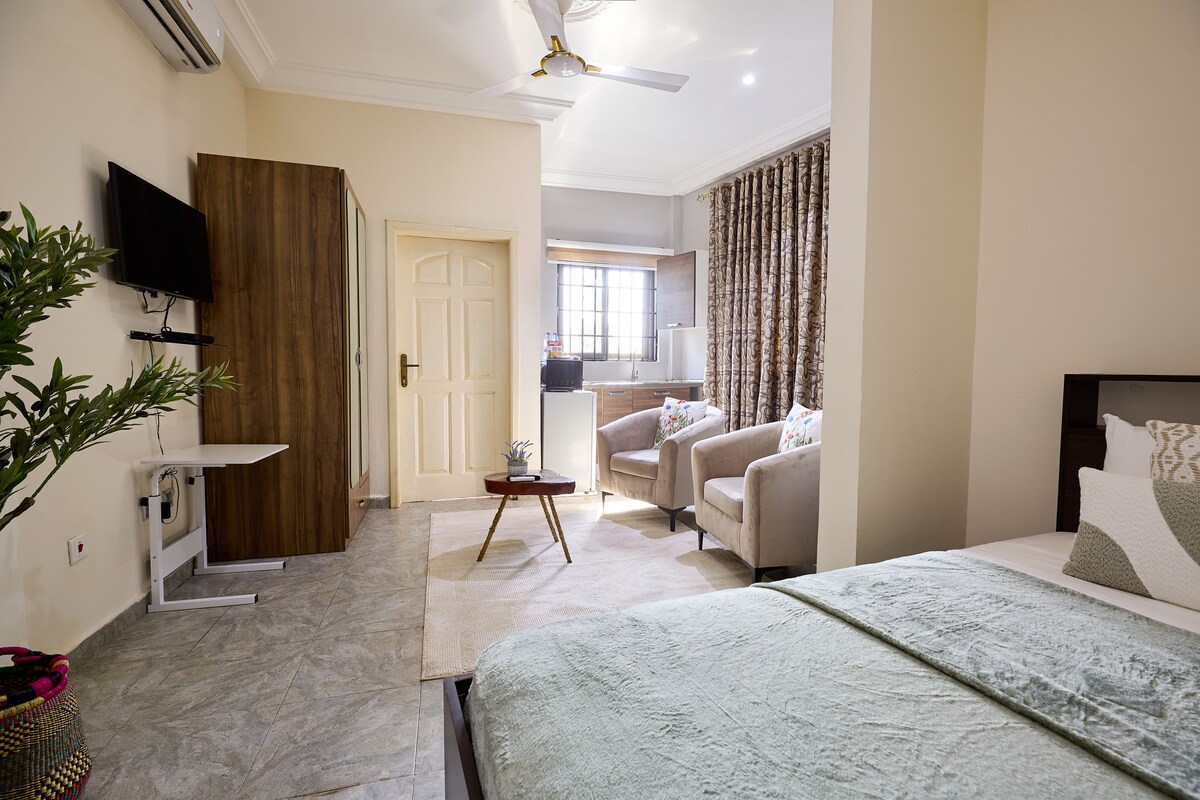 Relaxează-te cu stil. Ședere confortabilă și modernă în inima orașului Accra - Dzorwulu. Relaxează-te în acest spațiu frumos amenajat, perfect pentru călătorii singuri sau cupluri. La doar câteva minute de atracțiile, restaurantele și magazinele de top. Dispune de Wi-Fi rapid, Netflix (contul tău propriu), lenjerie de pat de pluș, o bucătărie complet utilată, piscină și atmosferă liniștită. Central strategic, la 10 minute de aeroport, aproape de ambasade, ministere, bănci și zone-cheie de afaceri. Este ideal atât pentru relaxare, cât și pentru productivitate.