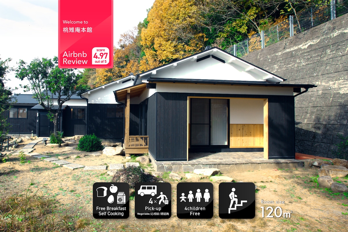 【岡山駅クルマ10分】120㎡貸別荘・檜風呂・元茶道教室が描く日本庭園・桃雉庵~Touchian~