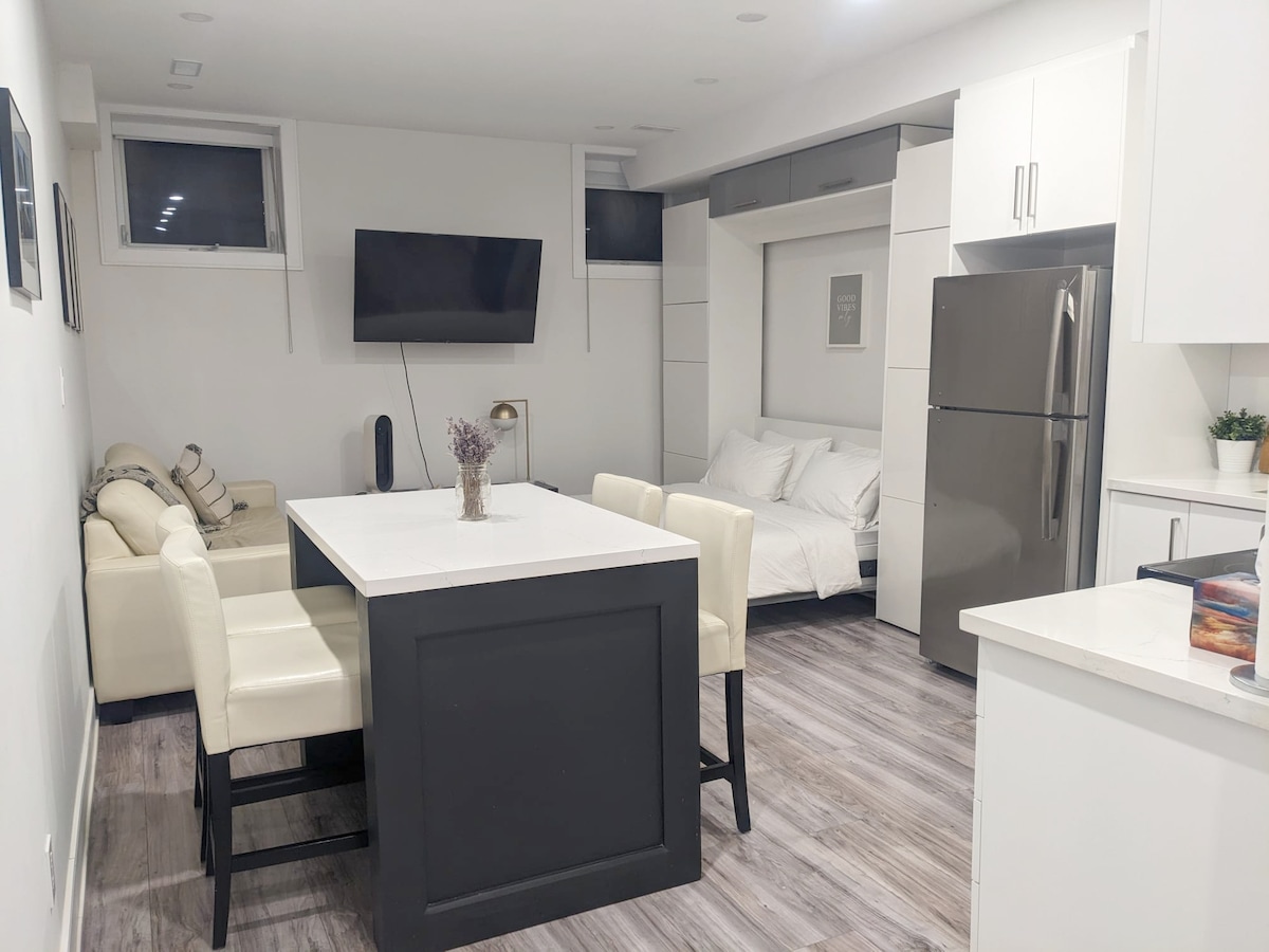 Acest dormitor/living/sufragerie și oază de bucătărie privată, luxoasă, se află la etajul al treilea al casei noastre de secol, cu vedere expansivă la orizontul orașului Toronto. Spațiul conține un dormitor cu pat matrimonial, o canapea extensibilă dublă în zona de living cu o saltea TempurPedic. O zonă de luat masa și o bucătărie complet utilată, cu o baie modernă adiacentă. Un balcon în aer liber înconjurat de verdeață, ideal pentru mese în aer liber. Este la 3 minute de mers pe jos de transportul public, la 20 de minute de mers pe jos de centrul orașului.
