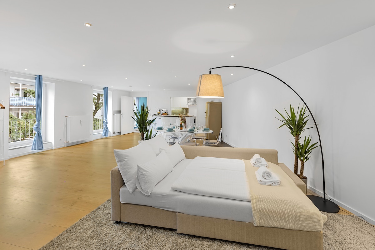 Modernes Apartment mit 6m Deckenhöhe direkt am Olympiapark. Gute Lage mit Cafés und Lebensmittelläden in direkter Umgebung. Echte Hartholzböden mit Bodenheizung, sowie eine wunderschöne 40 qm grosse Terrasse mit Loungebereich und Edelstahlgrill. Luxuriöse Küche mit Induktionsherd, Backofen, Kaffeemaschine, Mikrowelle, Saftpresse, KitchenAid Kochgeschirr. Das zweite Schlafzimmer verfügt über zwei 90cmx200cm Betten. Das dritte Schlafzimmer hat eine ausziehbares Doppelbett (180cmx200cm).