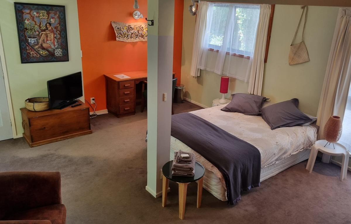 Evadează într-o oază urbană luxuriantă – ideală pentru un refugiu romantic, o vacanță relaxată sau o escală în Auckland. Te Kawa îmbină confortul și caracterul cu o seră cu lumină de basm, o cadă cu hidromasaj în aer liber și un teren de golf adăugat recent, creând un spațiu memorabil pentru relaxare. Proiectat arhitectural, cu interior îngrijit, apartamentul pentru oaspeți are un pat matrimonial, baie proprie, birou, balcon, facilități de cafea și ceai – adiacente locuinței gazdei, oferind totuși intimitate. • 25 de minute până la aeroport • 15 minute până la CBD