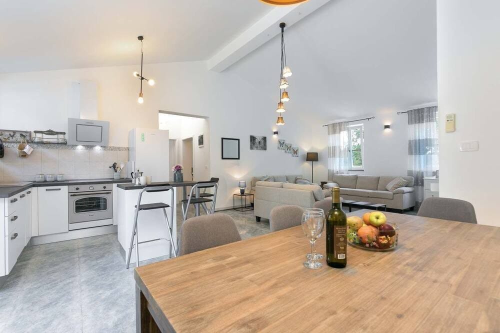 Casă bine întreținută, renovată recent. Living mare cu șemineu, două dormitoare cu aer condiționat separat și terasă mare cu masă în aer liber și grătar. WI-FI, TV prin satelit, două canapele în living și un pătuț portabil. Situat în Pićan, fostul sediu al unei eparhii istorice. Zona liniștită din centrul Istriei este locul perfect pentru a vă relaxa și a vă bucura de timpul liber cu familia și prietenii. Este, de asemenea, un bun punct de plecare pentru a ajunge la Rovinj, Pula, Opatija, Poreč sau Rabac.