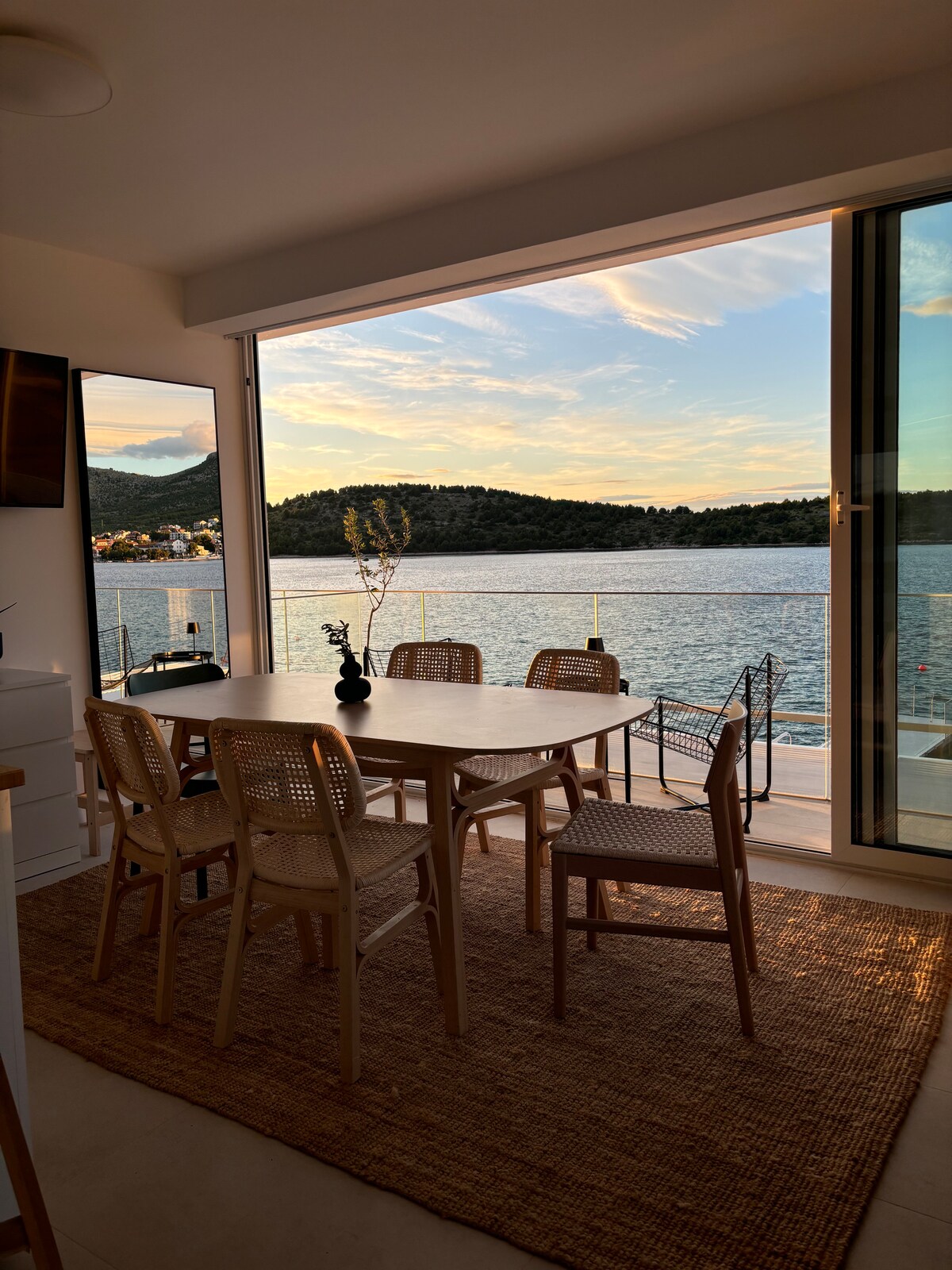 Trezește-te cu vedere panoramică la Marea Adriatică într-o casă liniștită deasupra orașului Primošten. Fiecare cameră are vedere la mare, iar cele patru dormitoare de la etaj se deschid spre o terasă privată largă pentru dimineți lente în aer liber. Piscina cu apă sărată este înconjurată de natură, perfectă pentru înot relaxat, în timp ce zona de living în plan deschis se deschide ușor spre grădină. Bucură-te de mese în bucătăria exterioară acoperită sau odihnește-te în salonul umbrit – o bază liniștită pentru familie sau prieteni, la doar o scurtă plimbare cu mașina de coastă.