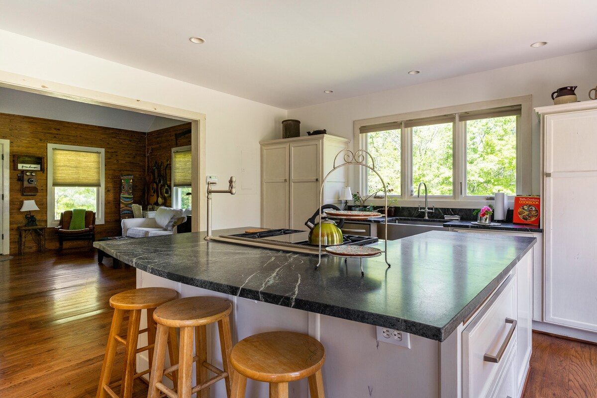 Ascunsă în inima izvoarelor calde istorice, această casă modernă cu două dormitoare de la mijlocul secolului oferă un sanctuar retras de grădină, unde colibri trec prin copaci și căprioare rătăcesc la asfințit. Înconjurat de verdeață luxuriantă și de ecoul moale al unui tren îndepărtat, acest refugiu liniștit te invită să te relaxezi și să savurezi ritmul atemporal al vieții rurale.