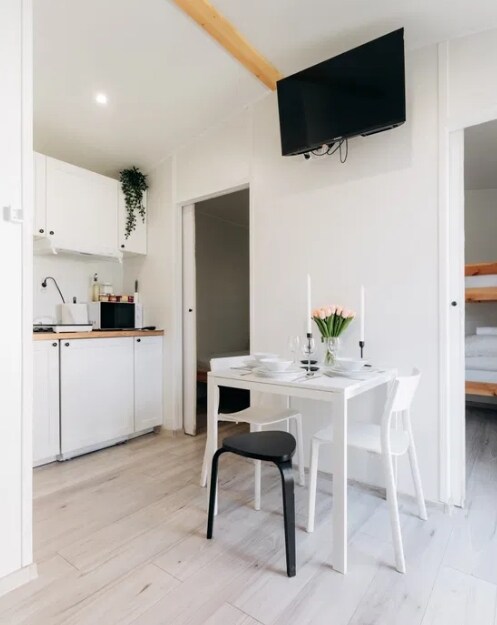 Apartament de inchiriat pentru 3 persoane cu chicinetă și baie cu duș. Există 2 paturi, o canapea extensibilă dublă, o masă și un dulap. Ca parte a închirierii apartamentului, poți utiliza terenul de mini golf și grătarul sau focul de tabără.
