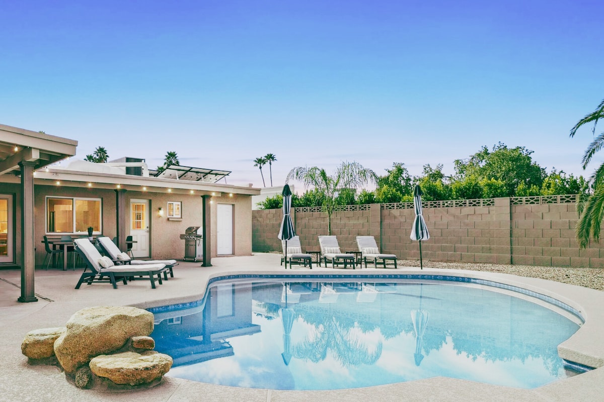 Bine ai venit la Scottsdale Great Escape, refugiul tău spațios și însorit. Aspectul deschis invită la o abundență de lumină naturală, creând o atmosferă caldă și primitoare. Indiferent dacă ești aici pentru a lucra sau a te relaxa, te-am acoperit cu Wi-Fi de mare viteză în spațiul de lucru dedicat, o bucătărie complet utilată, o curte interioară încântătoare cu un grătar în aer liber și o canapea confortabilă unde te poți relaxa și te poți bucura de emisiunile TV preferate. Pentru un plus de confort, există un garaj atașat.