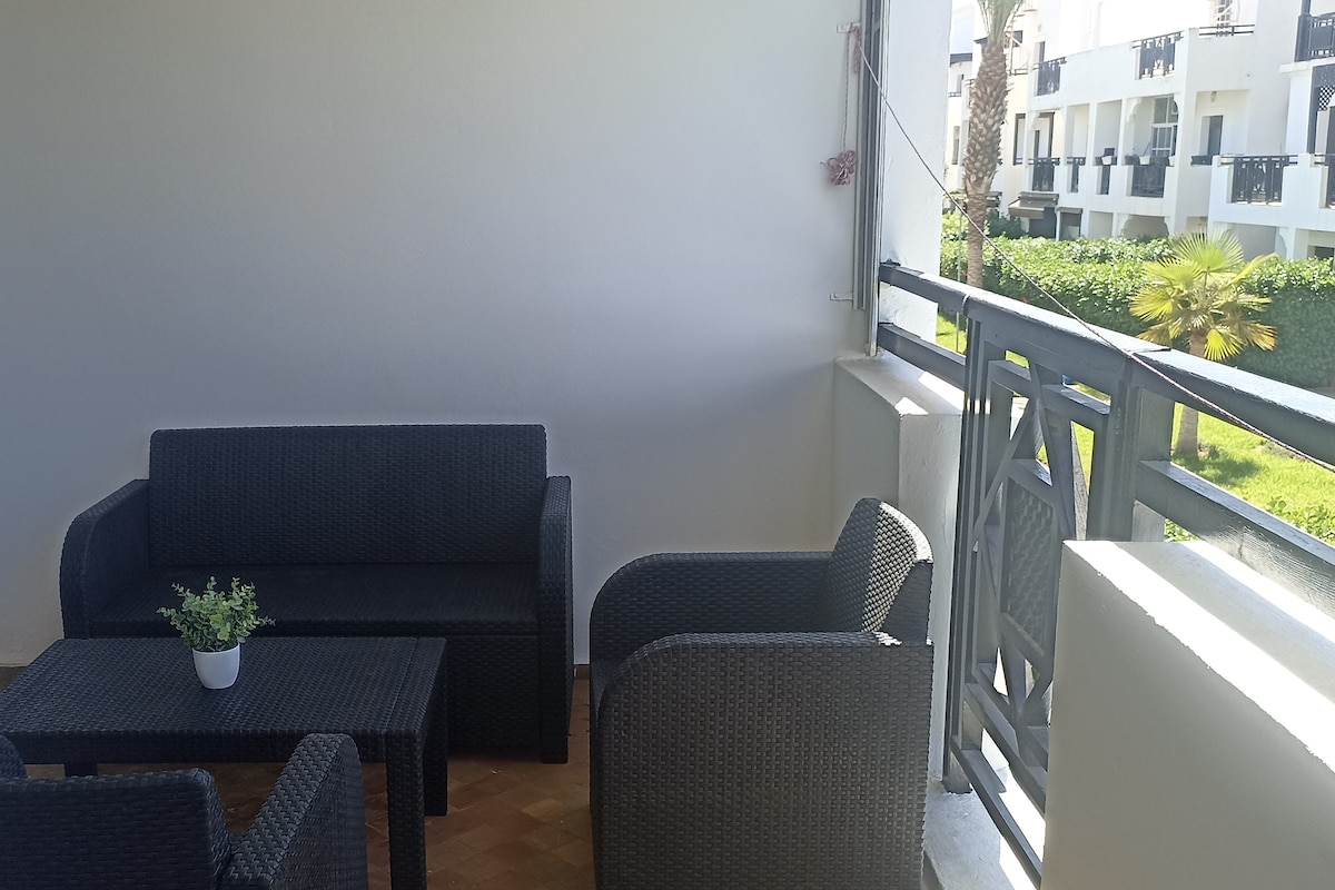 Appart récemment rénové situé dans une très belle résidence bien entretenue, sécurisée, beaucoup d’espaces verts, 2 piscines et 2 pataugeoires. La résidence se situe à 5 minutes à pied de la plage et de la Marina et à 10 minutes à pied de Marjane.L’appart est climatisée dans les 2 chambres. Une chambre avec un lit 2 places et un grand dressing et une chambre avec salon marocain.Douche italienne La cuisine super équipée, et dispose d’une lave linge. Il y a un grand balcon avec un salon de jardin
