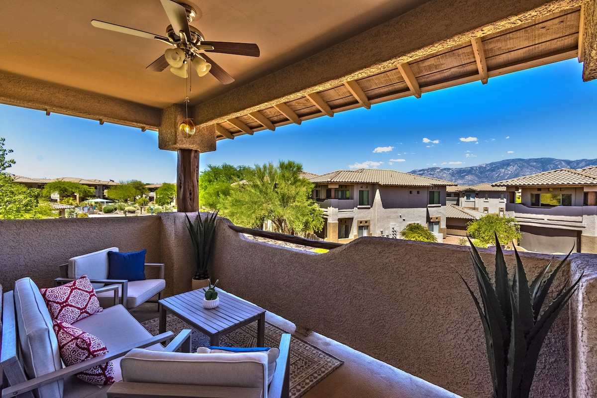 Wake up to sweeping views of the Santa Catalina Mountains from your private furnished balcony or through the wall of windows in the living room. This beautifully updated condo in Oro Valley sits inside a resort-style community with a heated pool, hot tub, and direct access to world-class hiking and biking — all in one of Arizona's most scenic and peaceful settings. Weekly and monthly discounts are automatically applied at checkout.