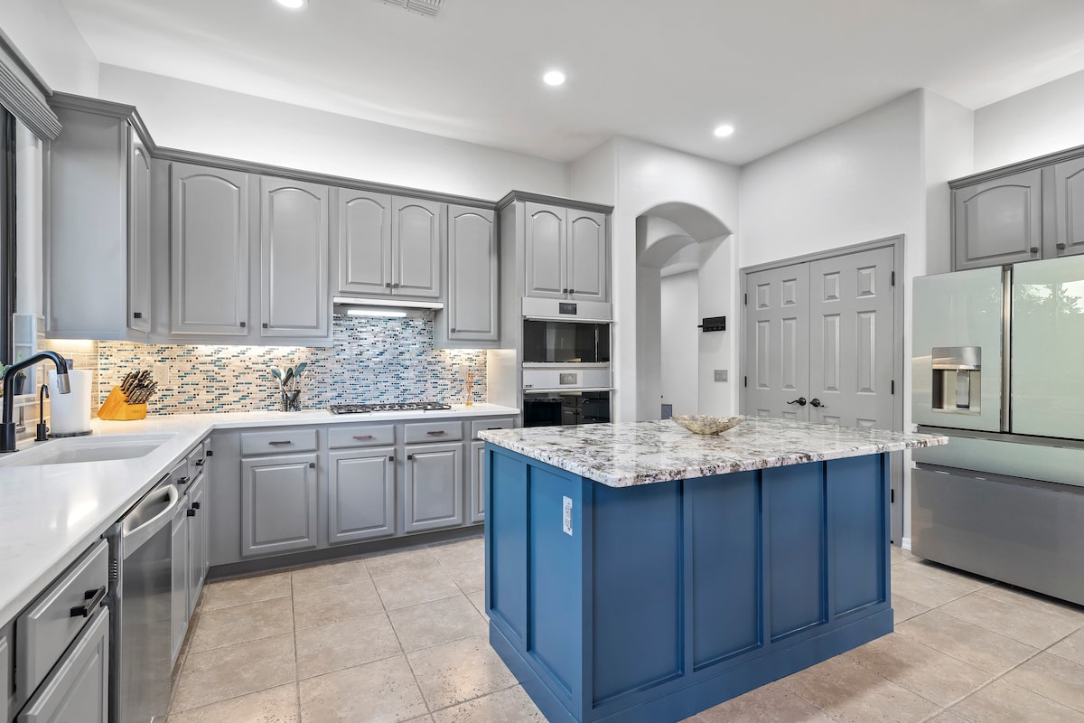 Luxury family home on popular golf course. Made for vacation and entertaining. A beautiful oasis backyard complete with HEATED pool, waterfall, BBQ & fire pit create a perfect outdoor ambiance. If you're looking to relax, take a soak in the hot tub or if you want to relax inside, sit in the oversize tub in the spa bathroom. Family friendly: complete with bunk beds, crib, an outdoor play set, books and toys. We appreciate military service professionals and offer a discount.