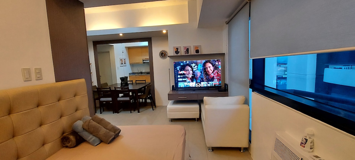 Looking for a fun, cozy, and techy escape? This 24sqm condo in EDSA Mandaluyong is your perfect staycation spot! Enjoy voice-activated smart living, 75” Premium QD Mini LED TV, delivering advanced HDR brightness and stunning picture performance and hotel-like comfort. Sip coffee on the balcony while catching a gorgeous sunset. Stay connected with 100mbps internet—perfect for couples, WFH days, or quick getaways. Stylish, comfy, and packed with cool features—your relaxing city escape starts here!