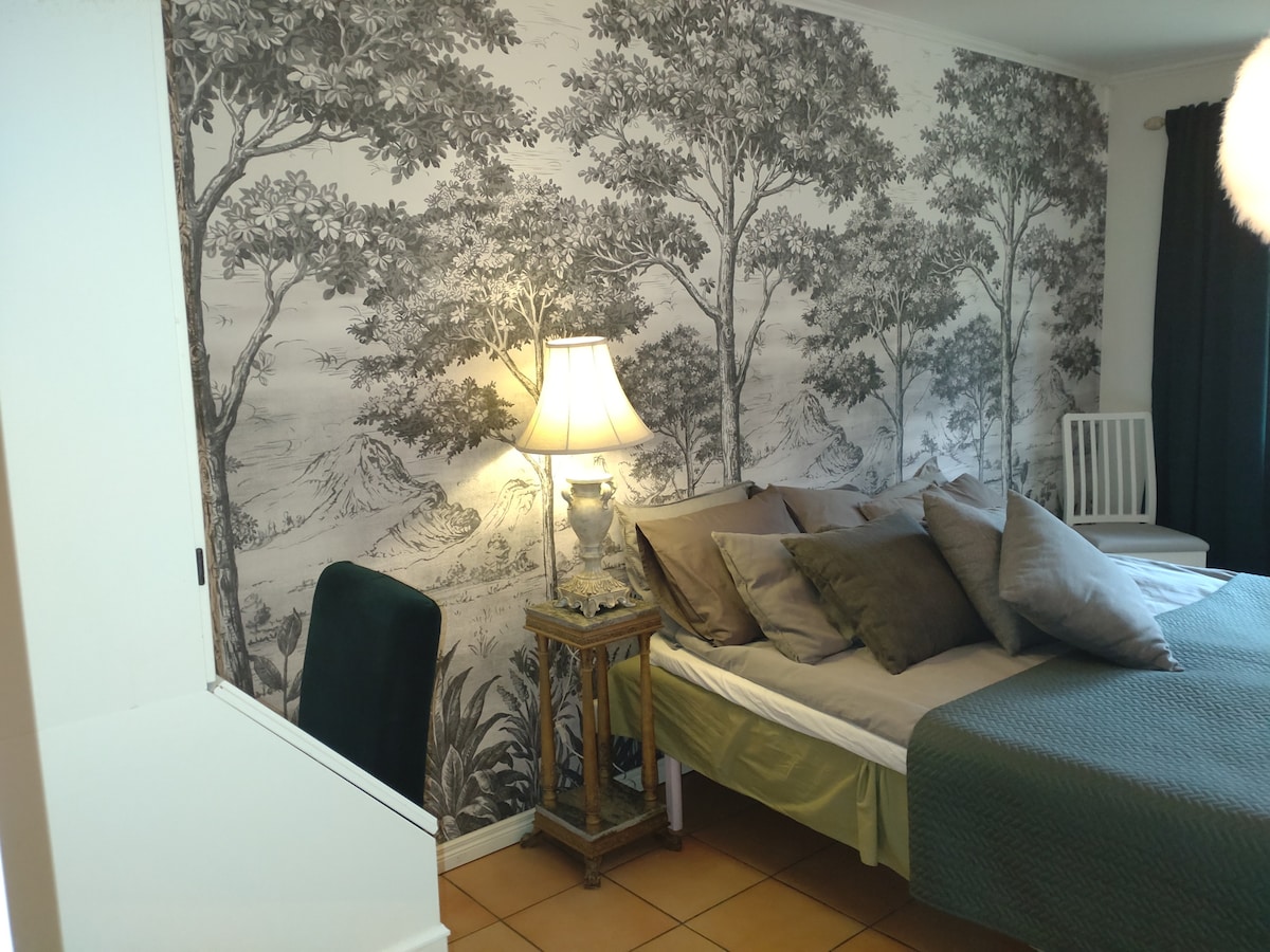 Welcome to a calm and charming apartment on the first floor of our villa, with a private entrance and a generous terrace for outdoor dining and small BBQ. Start your mornings with tranquil views of pine trees and a nearby pond, and enjoy a peaceful setting throughout the day. The fully equipped kitchen offers everything needed for a relaxed holiday stay. Sleeping arrangements include one bedroom with a queen-size bed, a single bed in a tucked-away sleeping nook, and an additional sofa bed.